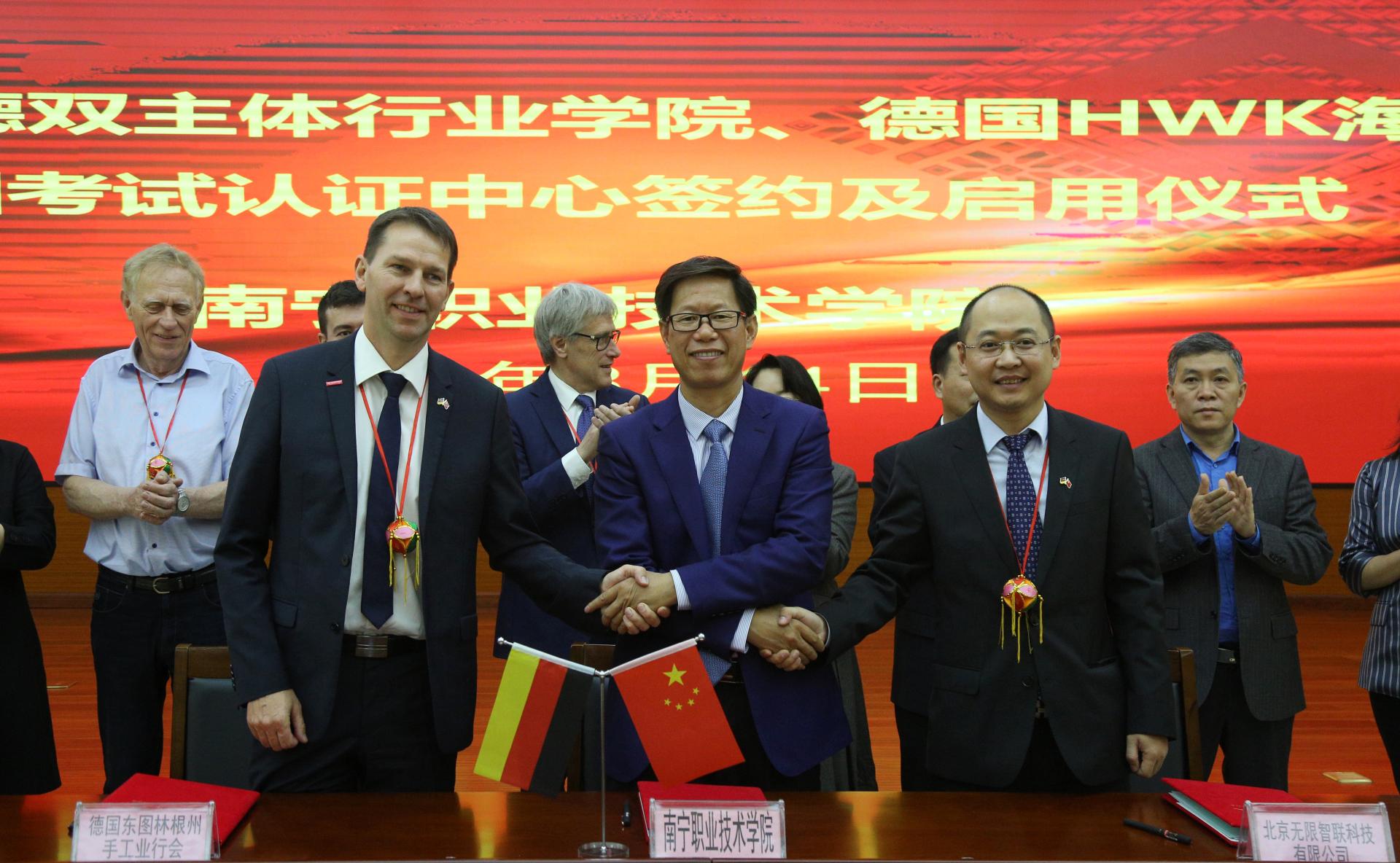 会晤交流结束后,与会领导一同见证了广西中德双主体行业学院、德国HWK海外培训考试认证中心的签约及启动仪式。