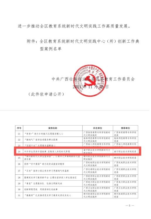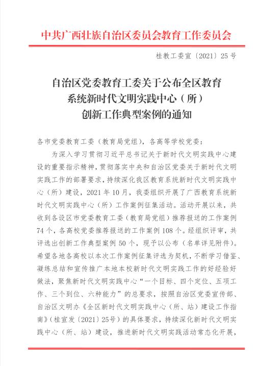 日前,中共广西壮族自治区委员会教育工作委员会公布全区教育系统新时代文明实践中心(所)创新工作典型案例结果,全区共有50个案例入选,我校“中外学生同讲中国故事,实践育人共筑时代梦想”一项案例入选。该案例是由校团委、国际学院结合国际学院开展新时代文明实践创新凝练成的最新成果。