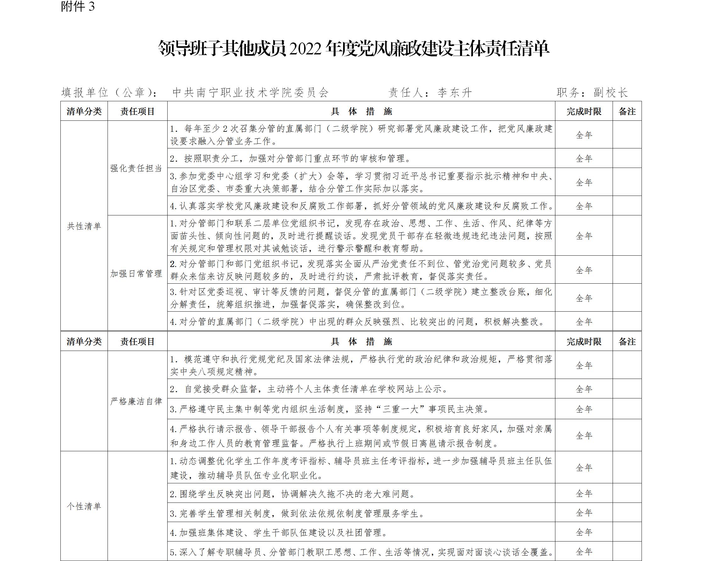 领导班子其他成员2022年度党风廉政建设主体责任清单