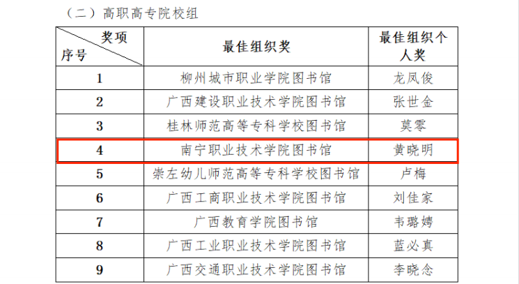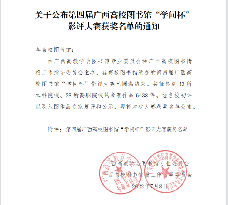 7月8日,由广西高教学会图书馆专业委员会、广西高校图书情报工作指导委员会主办的第四届广西高校图书馆“学问杯”影评大赛正式落下帷幕,我校图书馆表现突出荣获最佳组织奖。